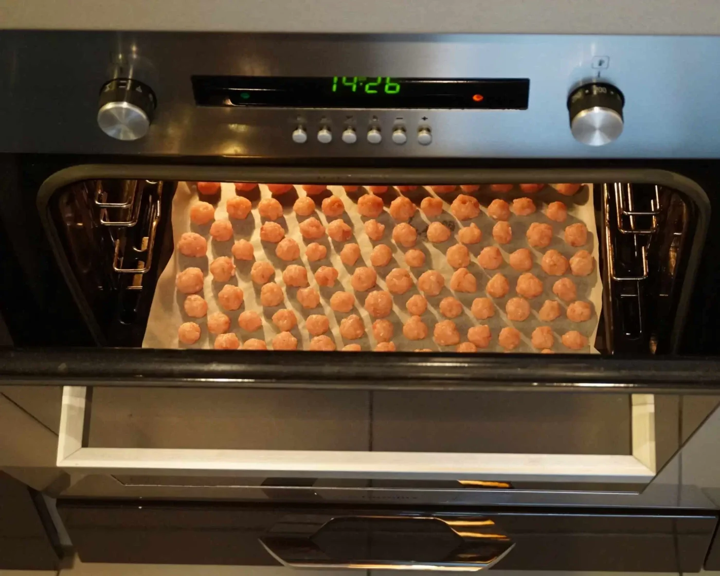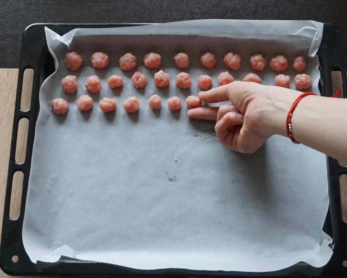 - Tear small pieces of meat, forming small balls with a circular motion of your palms, slightly flattening the sides before placing them on the tray. This process takes a considerable amount of time, and you’ll likely fill at least three pans with the mixture.
