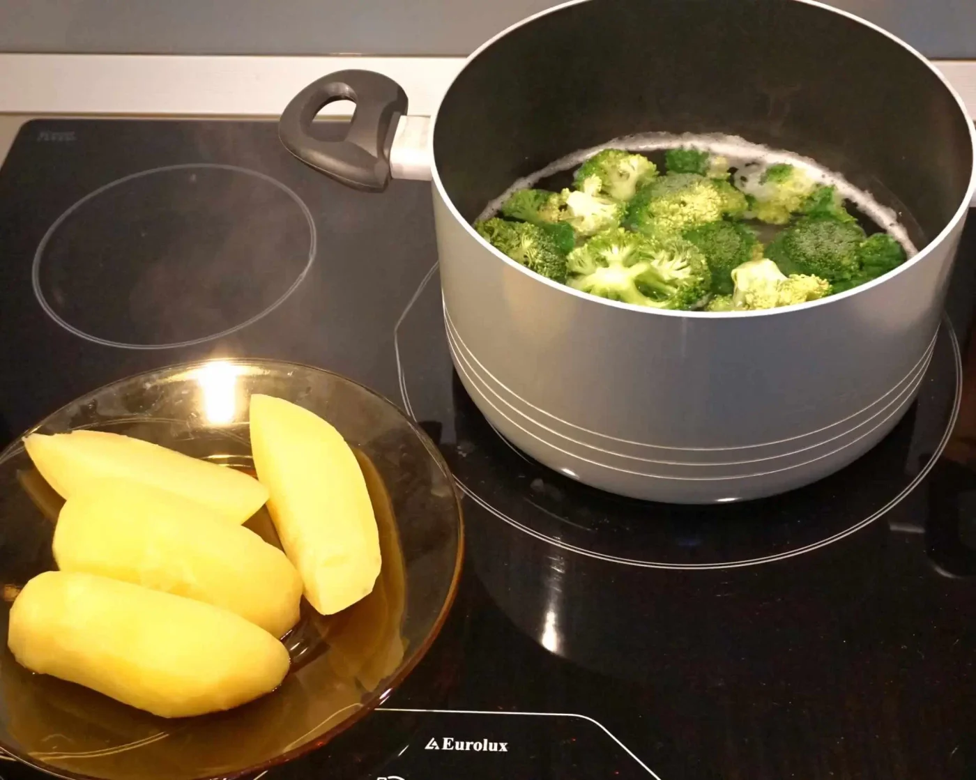 - Place the potato in a pot and add enough water (you’ll need it later for the broccoli and rice). Boil the water and cook the potato for 20 minutes.