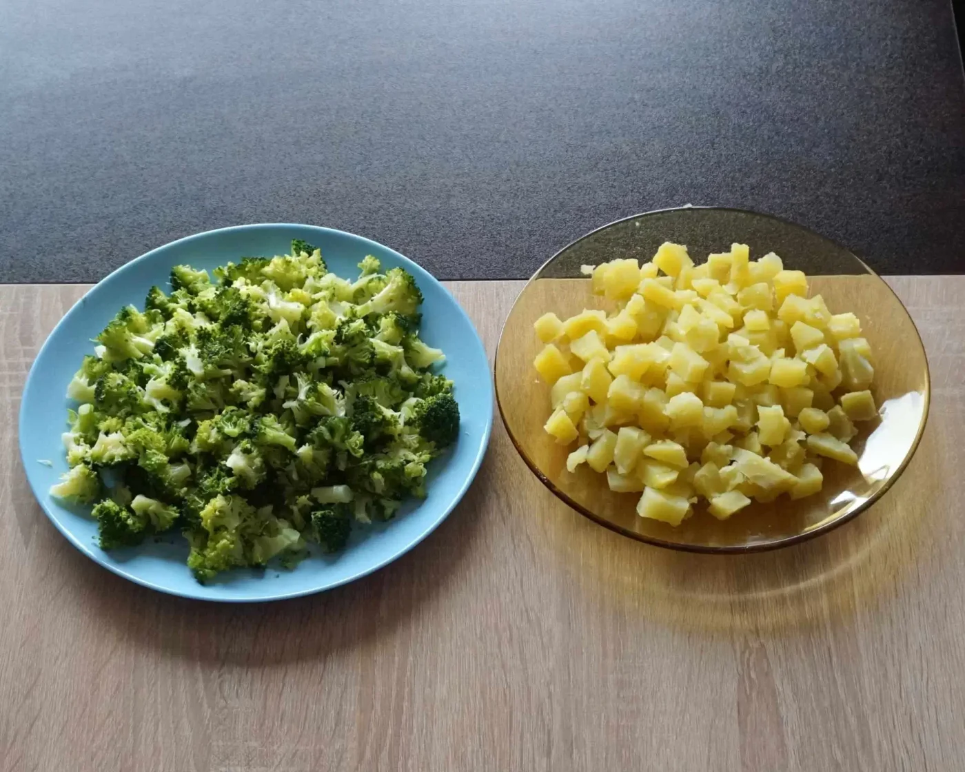 - Cut the cooked potato into small cubes and the broccoli florets into even smaller pieces.