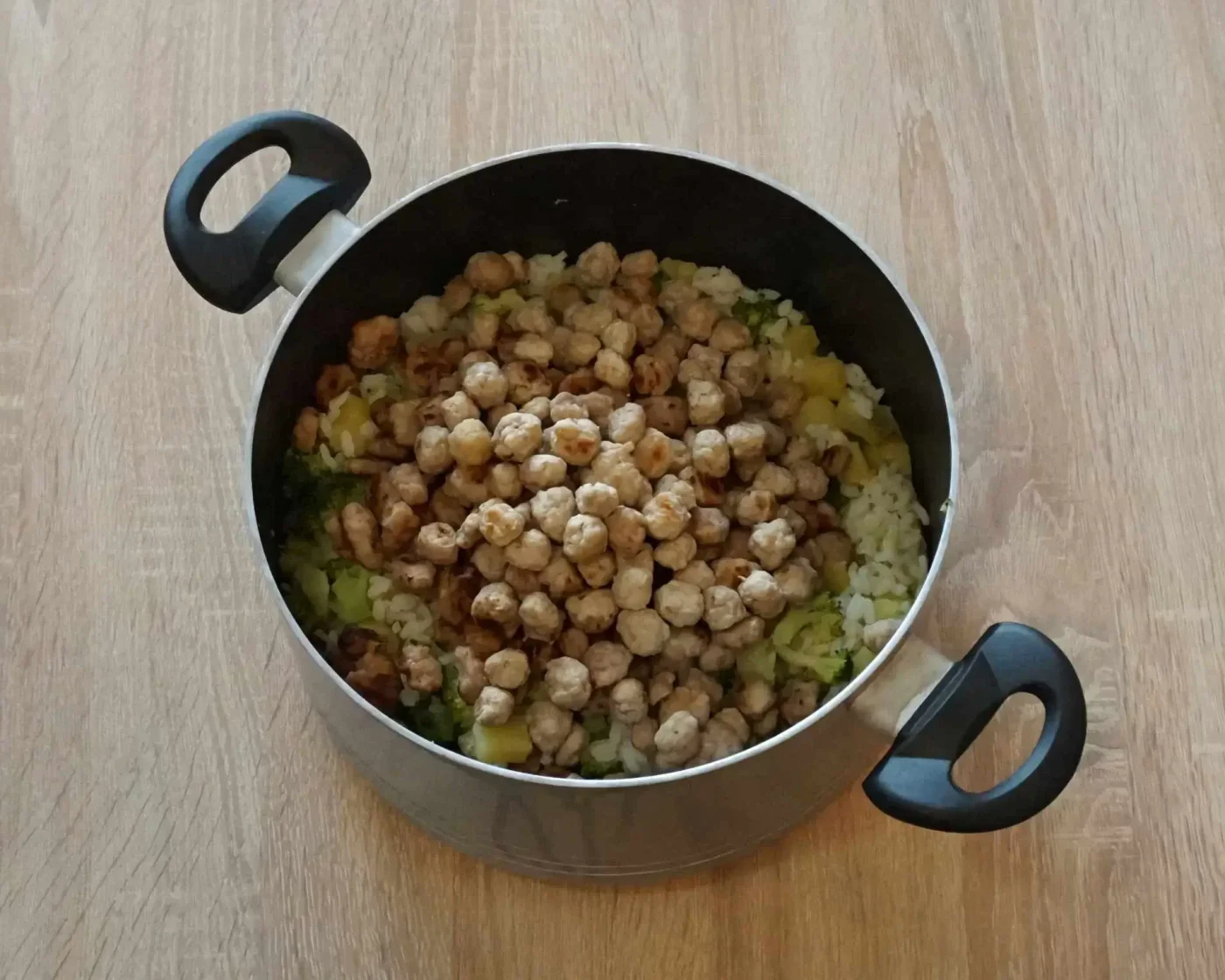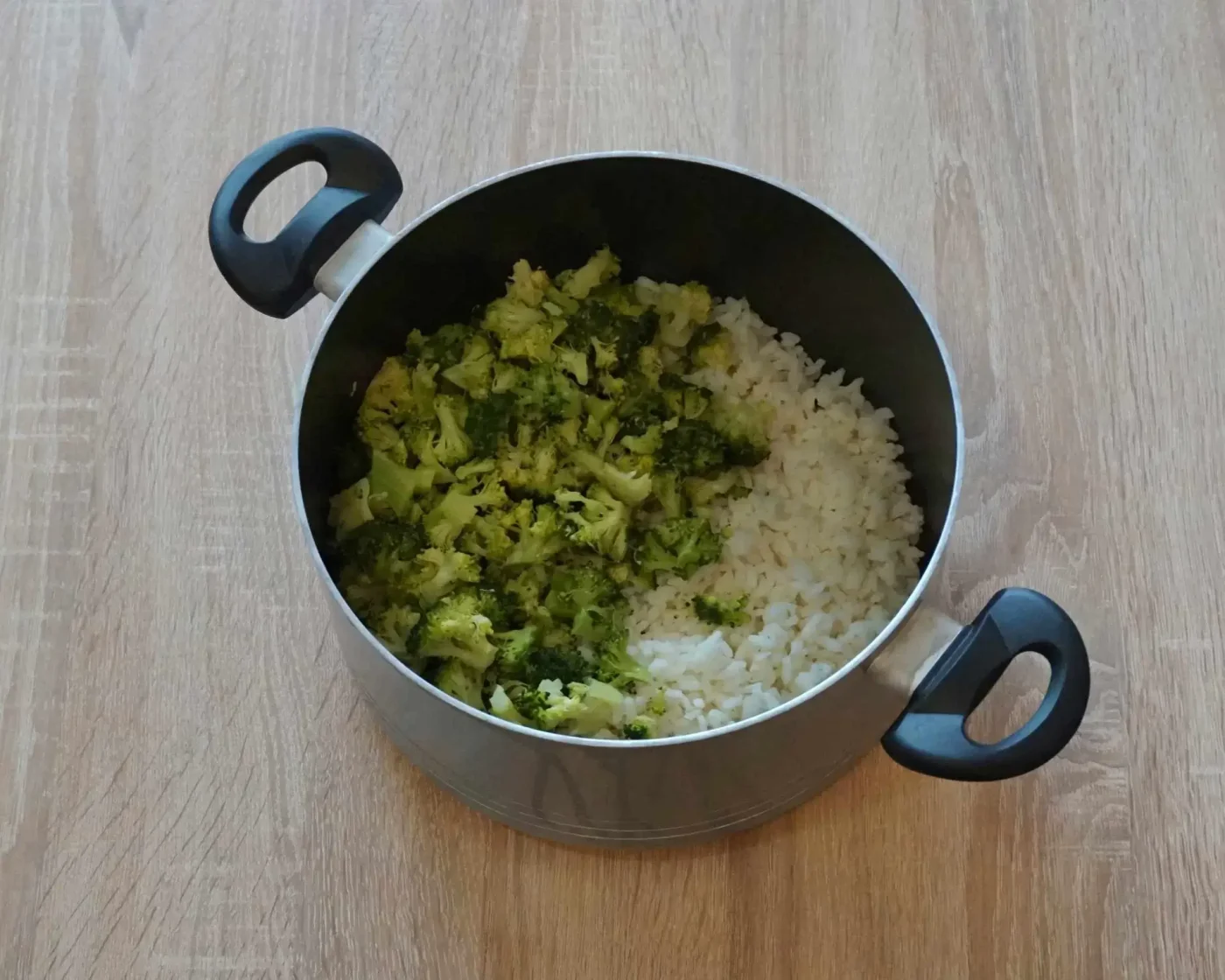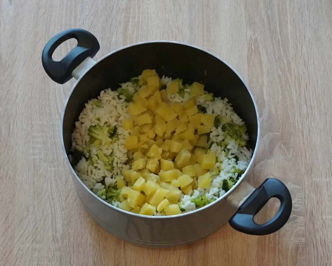 - Drain the water from the rice and, in a large pot, layer the rice, broccoli, and potato, mixing the ingredients thoroughly.